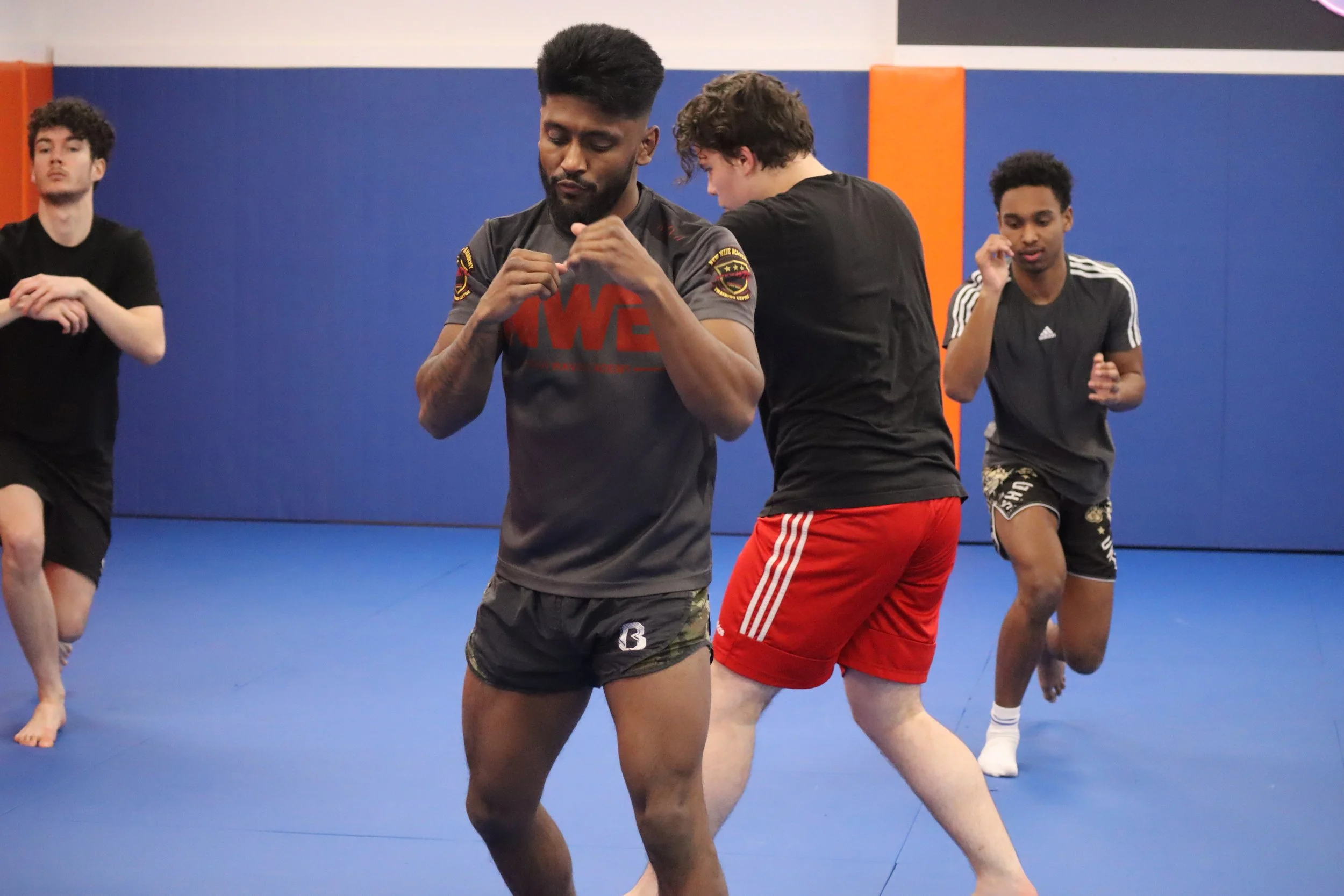 Coaches cover a theme that progresses in each class across the course of a week (eg. clinch work). 50% of class time is spent drilling and 50% participating in live sparring. Sparring rounds are 5 minutes each with a 30 second break to change partners.